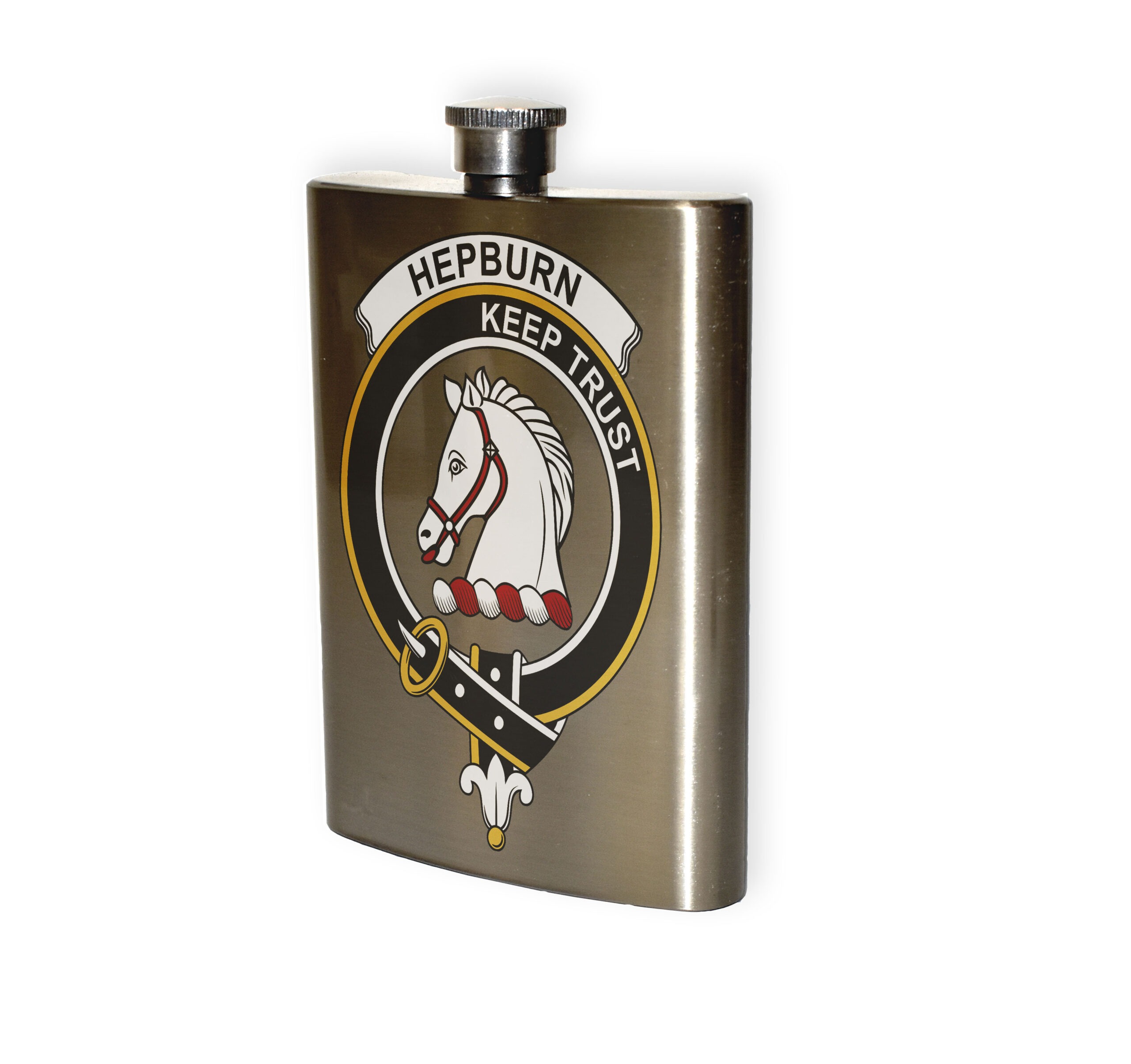 Hepburn Clan Crest Stainless Steel Hip Flask – 8oz.